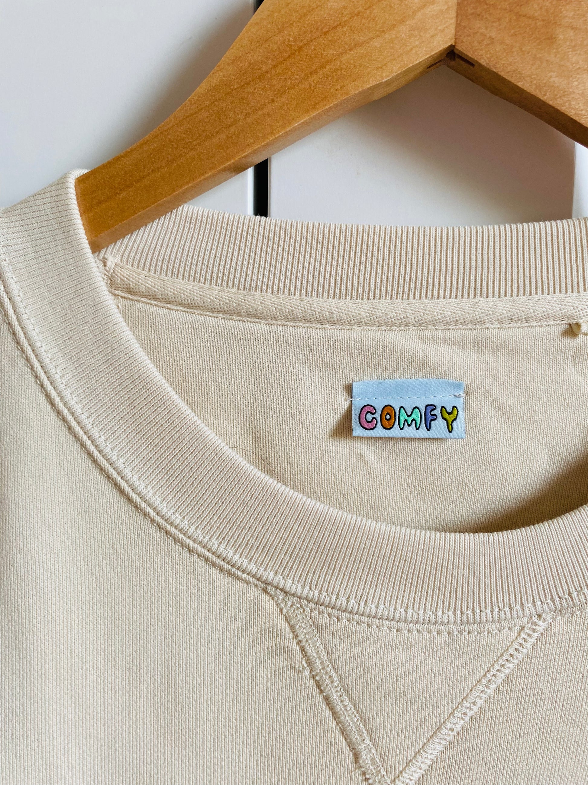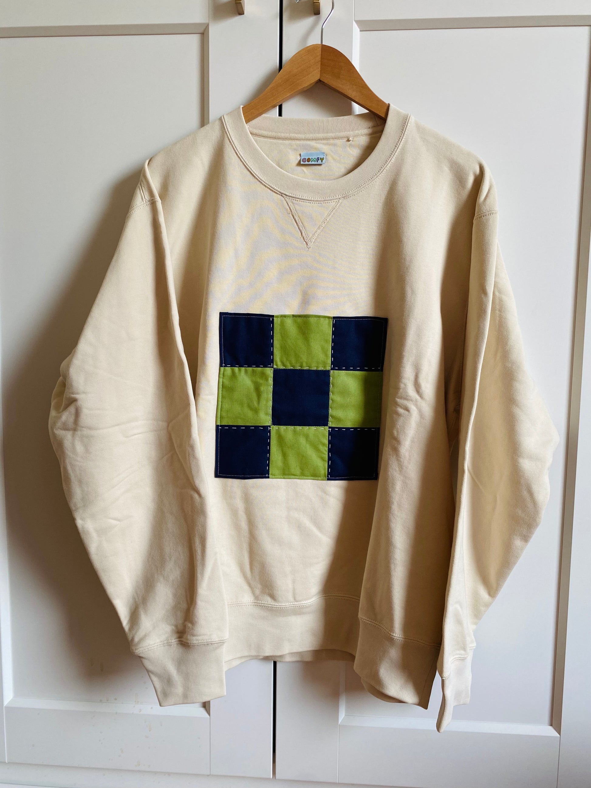 This crewneck sweatshirt is extra cozy with a handmade checkerboard quilt block.