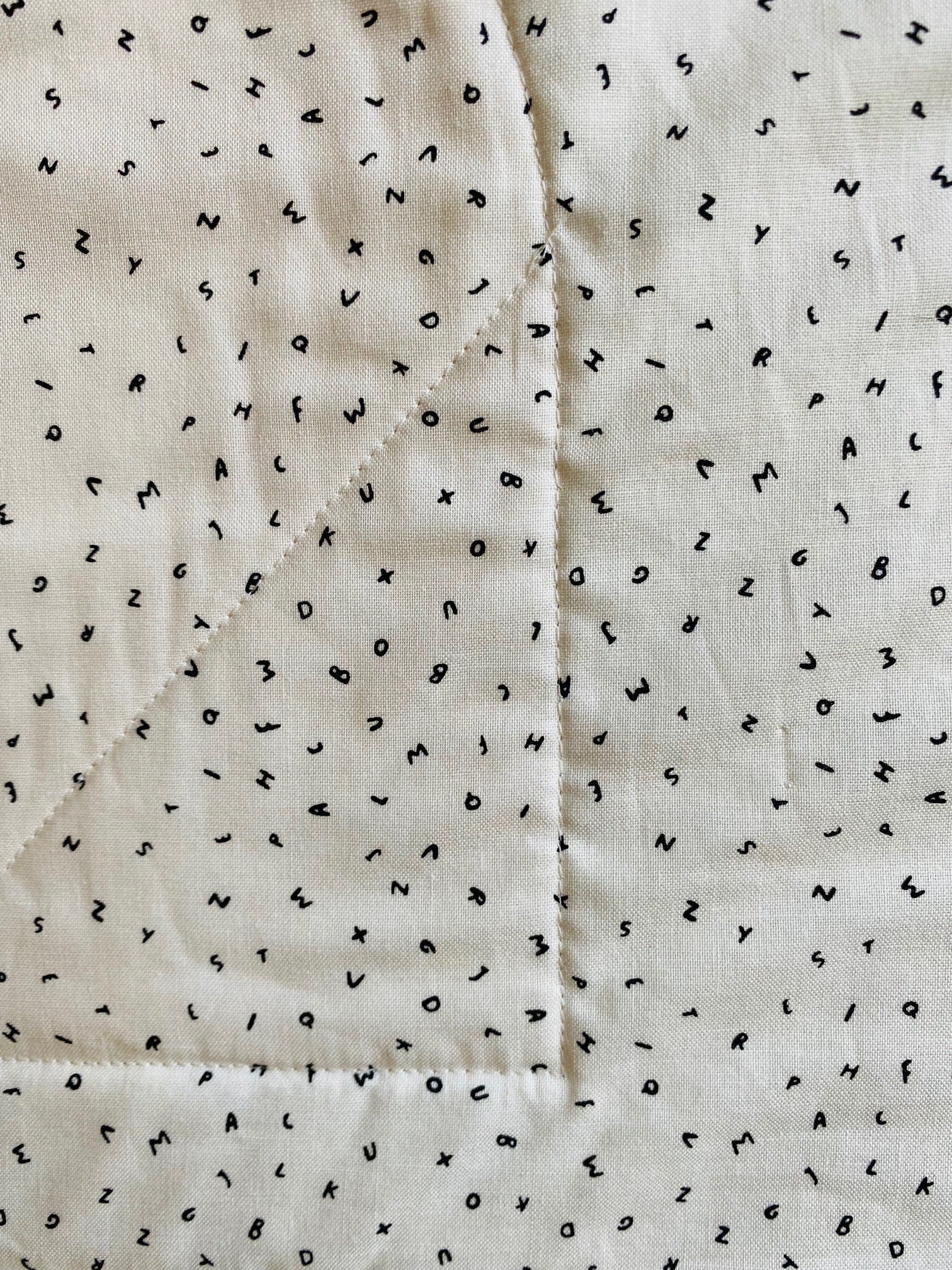 This is part of a series of whole-cloth baby quilts I designed, had digitally printed on cotton and sewed together. Each one is inspired by a song and this one is called (wait for it) "ABC."