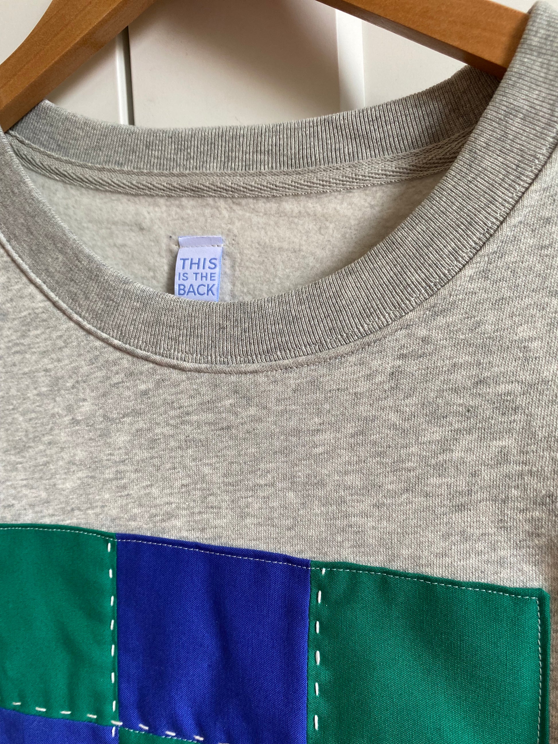 This crewneck sweatshirt is extra cozy with a handmade checkerboard quilt block.