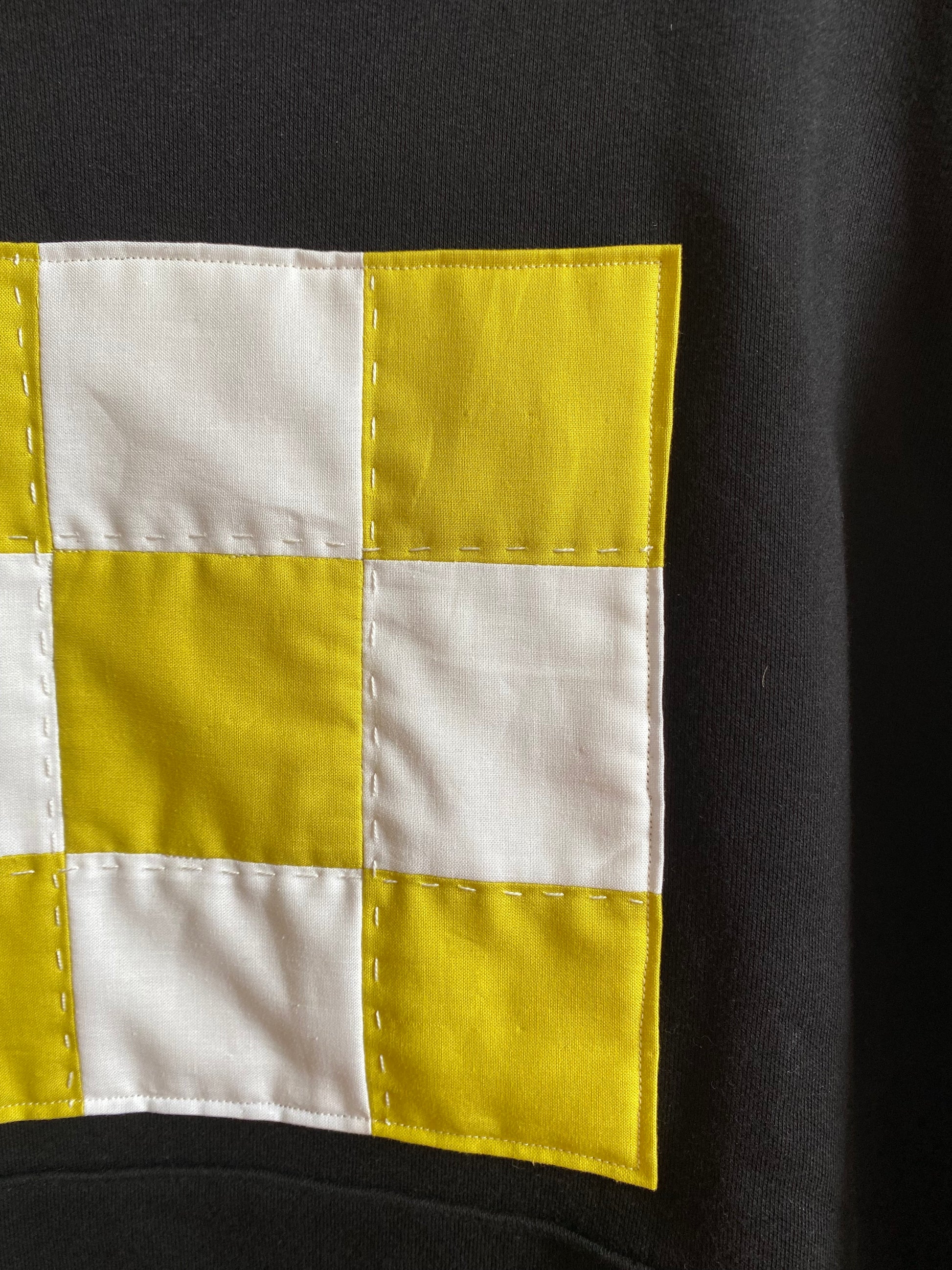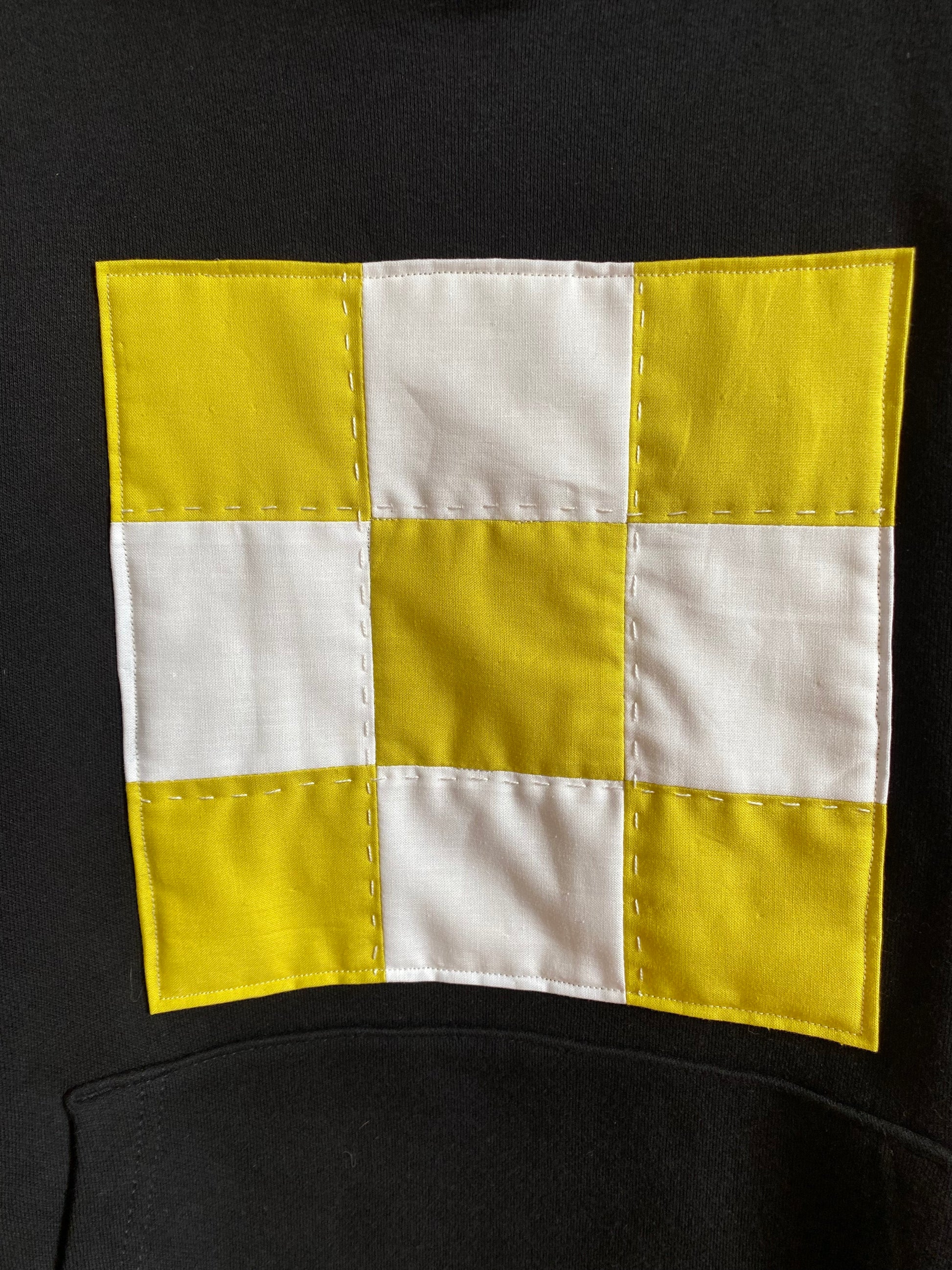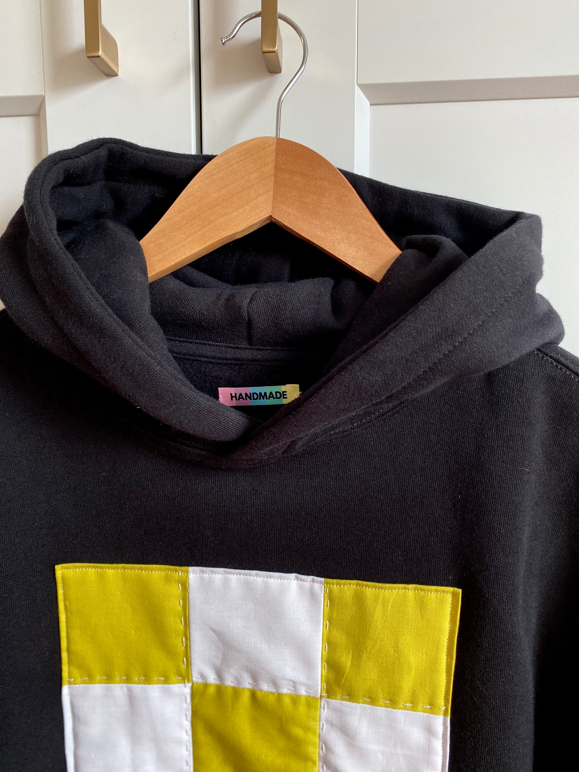 This hoodie is extra cozy with a handmade checkerboard quilt block.